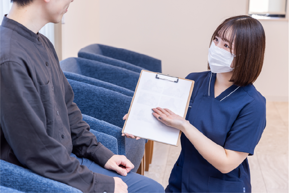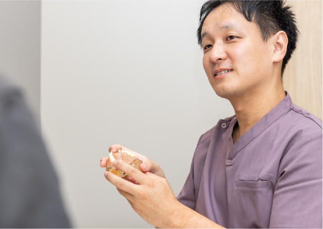 歯科治療は、ただ歯を治すだけではなく、患者様が安心して通える環境づくりが大切だと考えています。治療の説明がない、忙しそうで話しづらい、そのような経験から、歯医者に苦手意識を持ってしまう方も少なくありません。当院では、じっくりお話を伺い、丁寧に説明しながら診療を進めていきます。何をされるのかわからない不安をなくし、納得した上で治療を受けていただけるよう、患者様との対話を大切にしています。