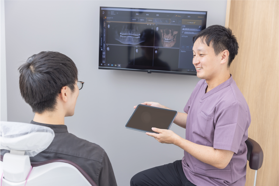 歯科治療は、ただ歯を治すだけではなく、患者様が安心して通える環境づくりが大切だと考えています。治療の説明がない、忙しそうで話しづらい、そのような経験から、歯医者に苦手意識を持ってしまう方も少なくありません。当院では、じっくりお話を伺い、丁寧に説明しながら診療を進めていきます。何をされるのかわからない不安をなくし、納得した上で治療を受けていただけるよう、患者様との対話を大切にしています。